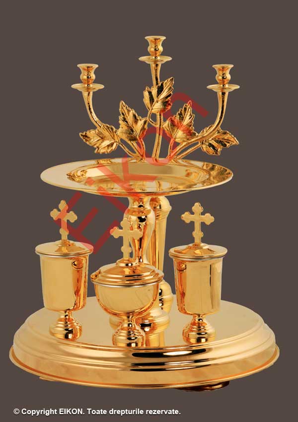 Litier aurit Inaltime: 38 cm. Diametrul bazei de jos: 30 cm. Diametrul bazei de sus: 22 cm. Greutate 3.5 kg. Fabricat în Rusia, Sofrino. Obiecte bisericești Sofrino